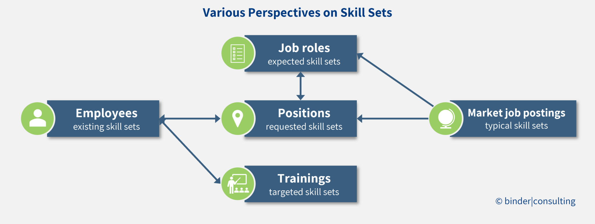 The world of skill management entails many contexts and logics that are difficult to comprehend at first glance. To understand how skills may be used in an organization, it helps to see skills from various perspectives: employees, positions, job roles, trainings, and job postings. Exemplary use cases like the one above are useful to visualize the connections.